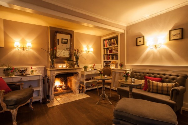 *im Kaminzimmer mit offenem Feuer oder