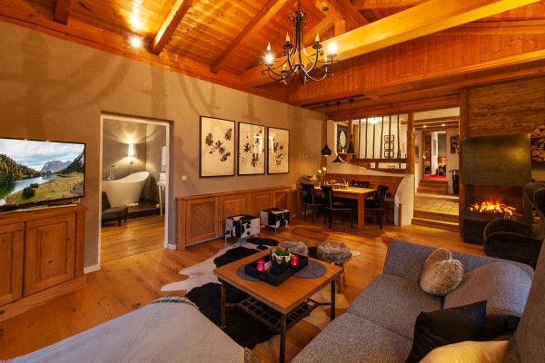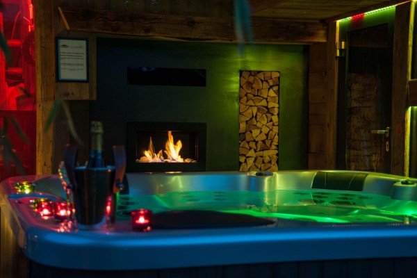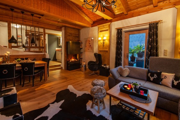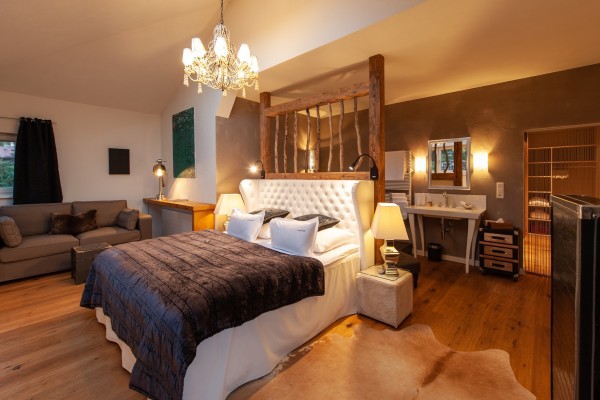 Die PANORAMA SUITE mit private finnische Infrarot-Zirbensauna,kuscheligem Kamin mit Effektfeuer ,Blick auf die Sterne,Wein Kühlschrank...