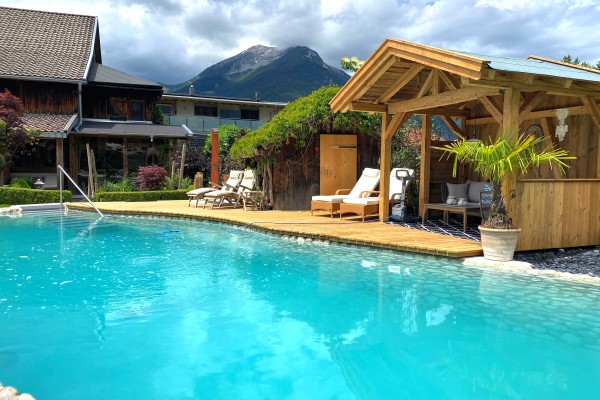 Im Sommer bietet Ihnen unser Natur Schwimmteich mit türkisblauem Wasser eine angenehme Abkühlung.