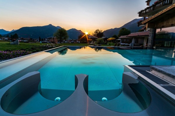 Innenschwimmbereich mit angrenzendem Infinity Felsenpool (Außenpool). Stadl SPA mit verschiedenen Saunen, Dampfbädern, und zwei Ruheräumen. Fitness, Massagen und Anwendungen zubuchbar.